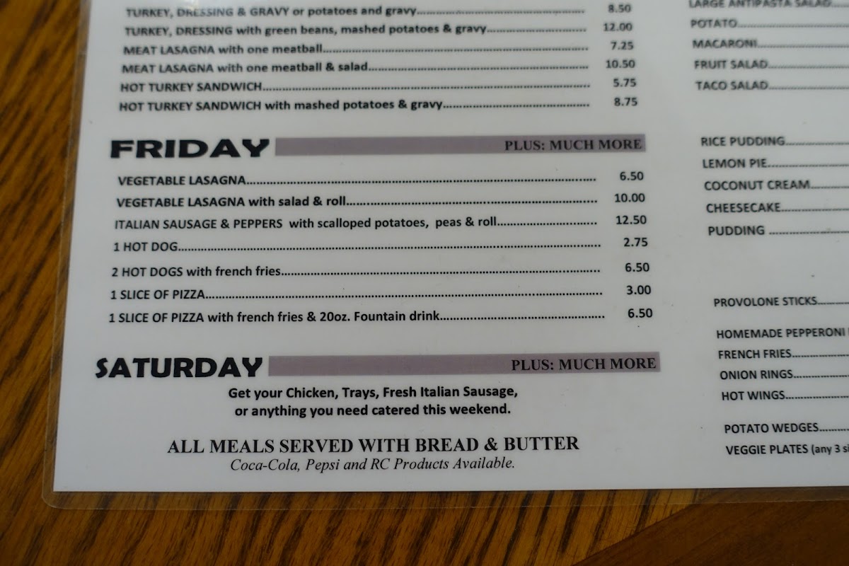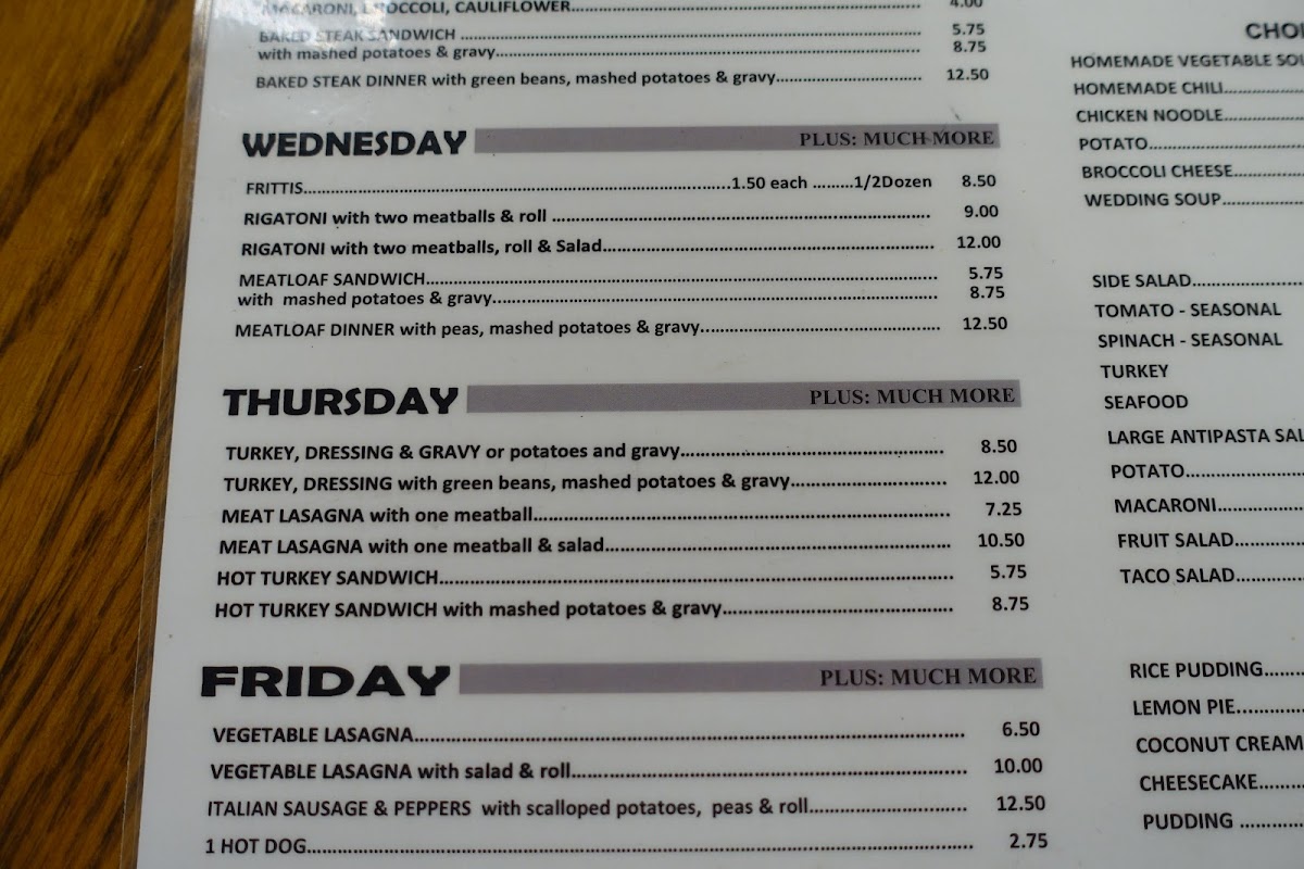 On any given visit, you might enjoy a comforting bowl of homemade chili or soup—options like chicken noodle or broccoli cheese make for satisfying midday meals. For something more substantial, the menu features casual favorites such as rigatoni with meatballs or a meatloaf dinner, often accompanied by fresh rolls and salads that balance wholesomeness with ease.